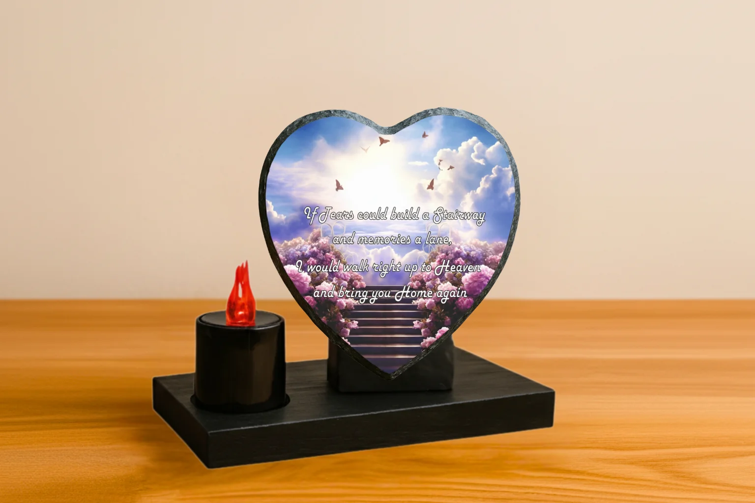 Our memorial plaques are made from real slate with a natural stone uneven texture edge. Slight variations in the size of slate and natural imperfections or pits in the surface, which may be visible in the final print, all give each slate its own distinct and unique features.