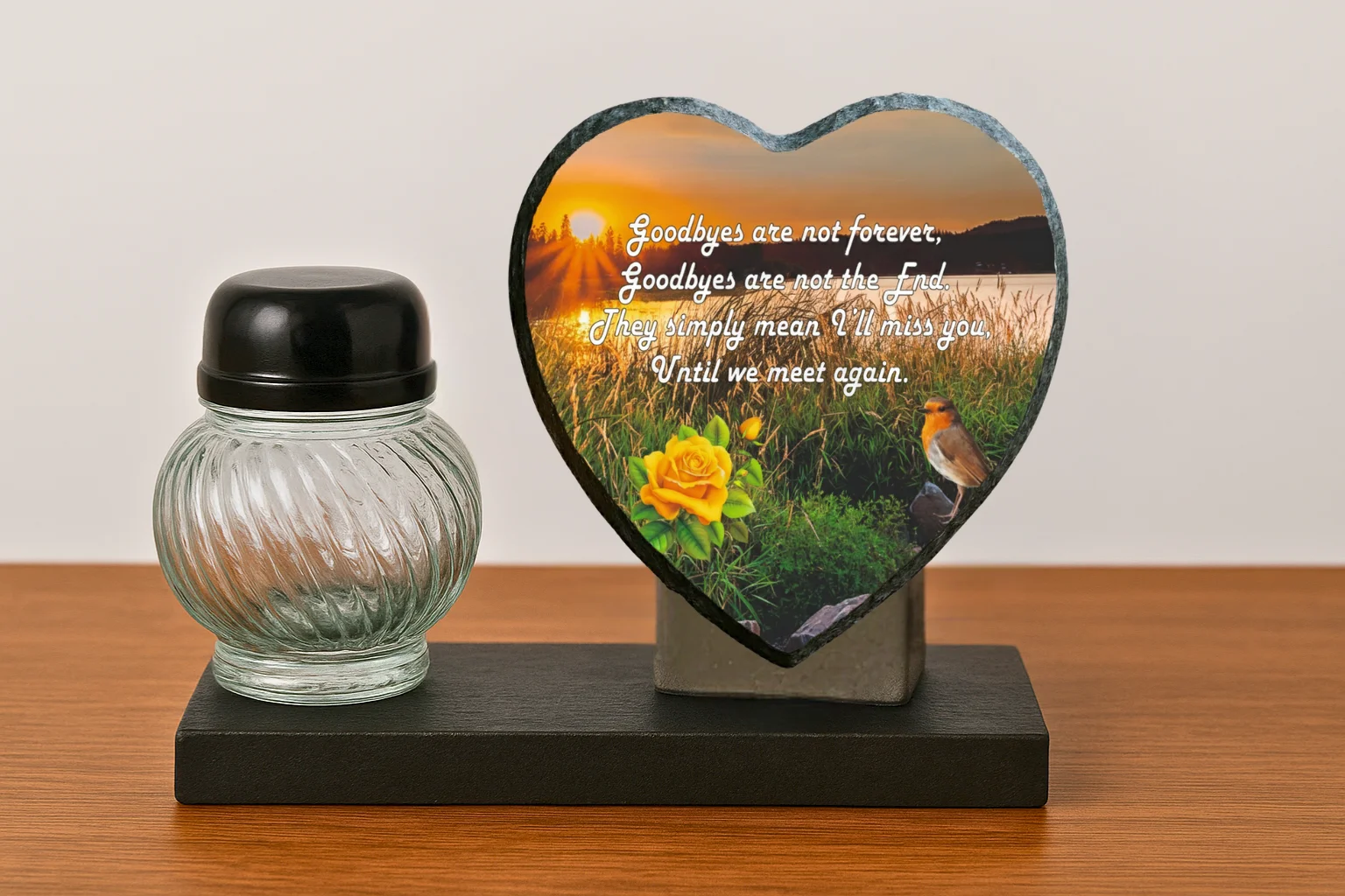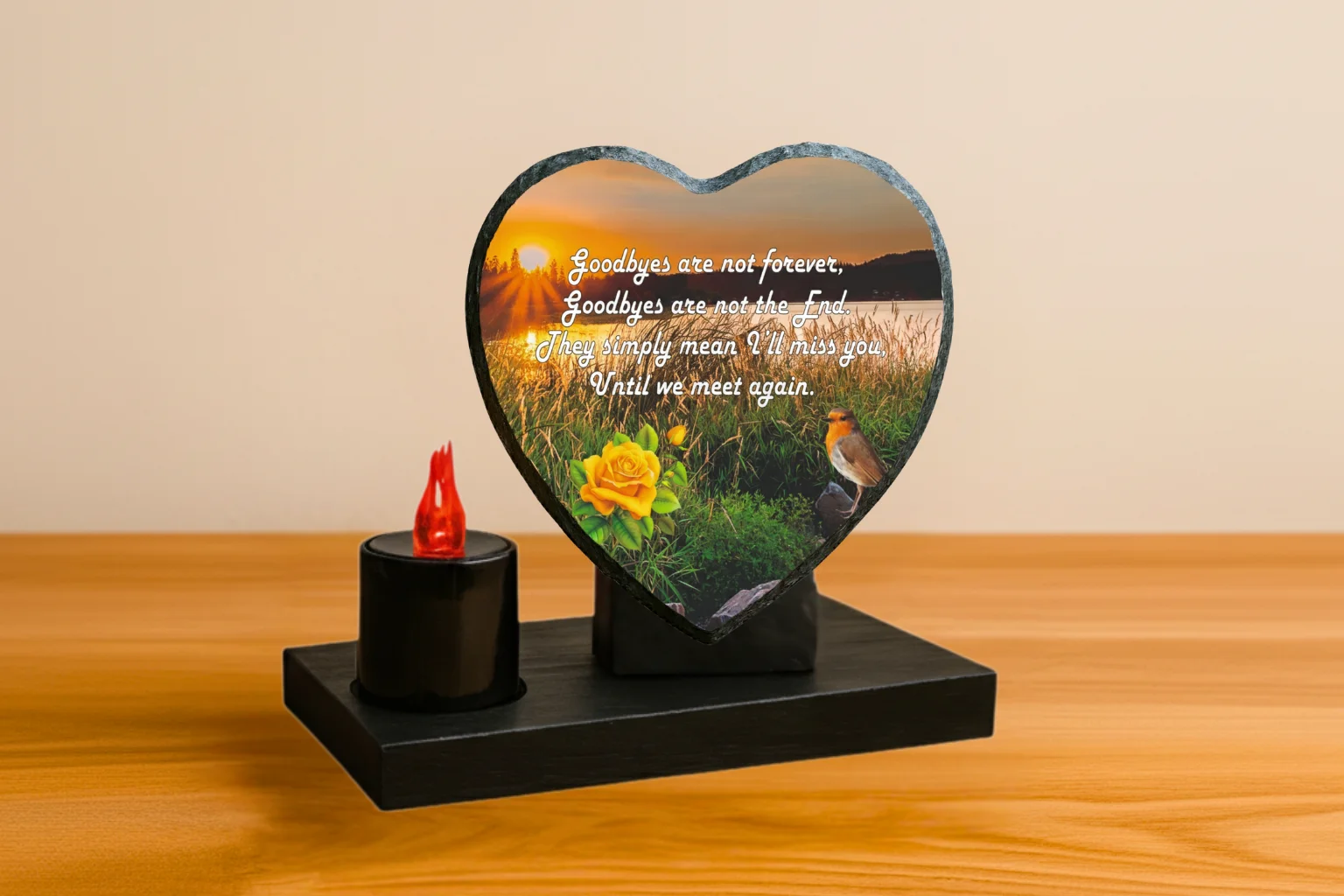 Our memorial plaques are made from real slate with a natural stone uneven texture edge. Slight variations in the size of slate and natural imperfections or pits in the surface, which may be visible in the final print, all give each slate its own distinct and unique features.