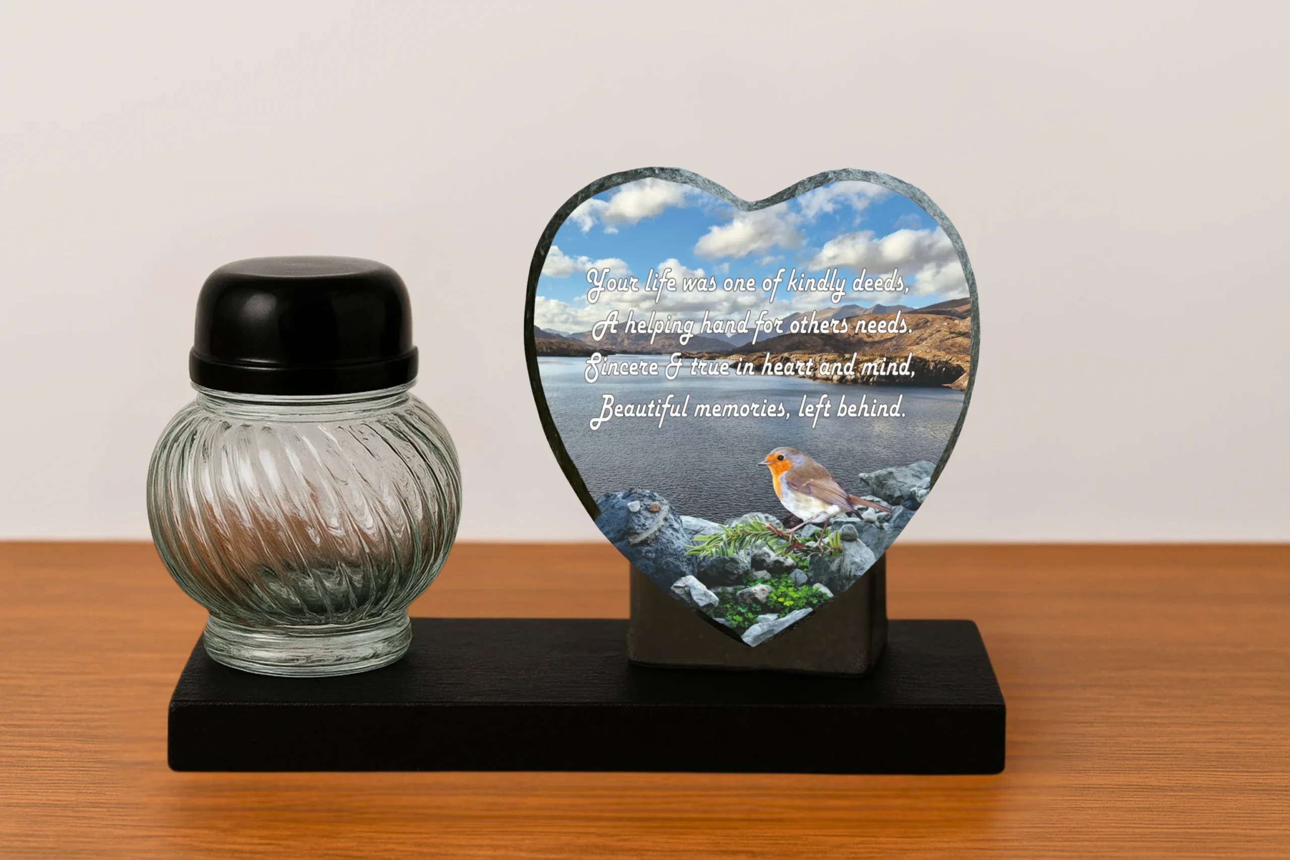 Our memorial plaques are made from real slate with a natural stone uneven texture edge. Slight variations in the size of slate and natural imperfections or pits in the surface, which may be visible in the final print, all give each slate its own distinct and unique features.