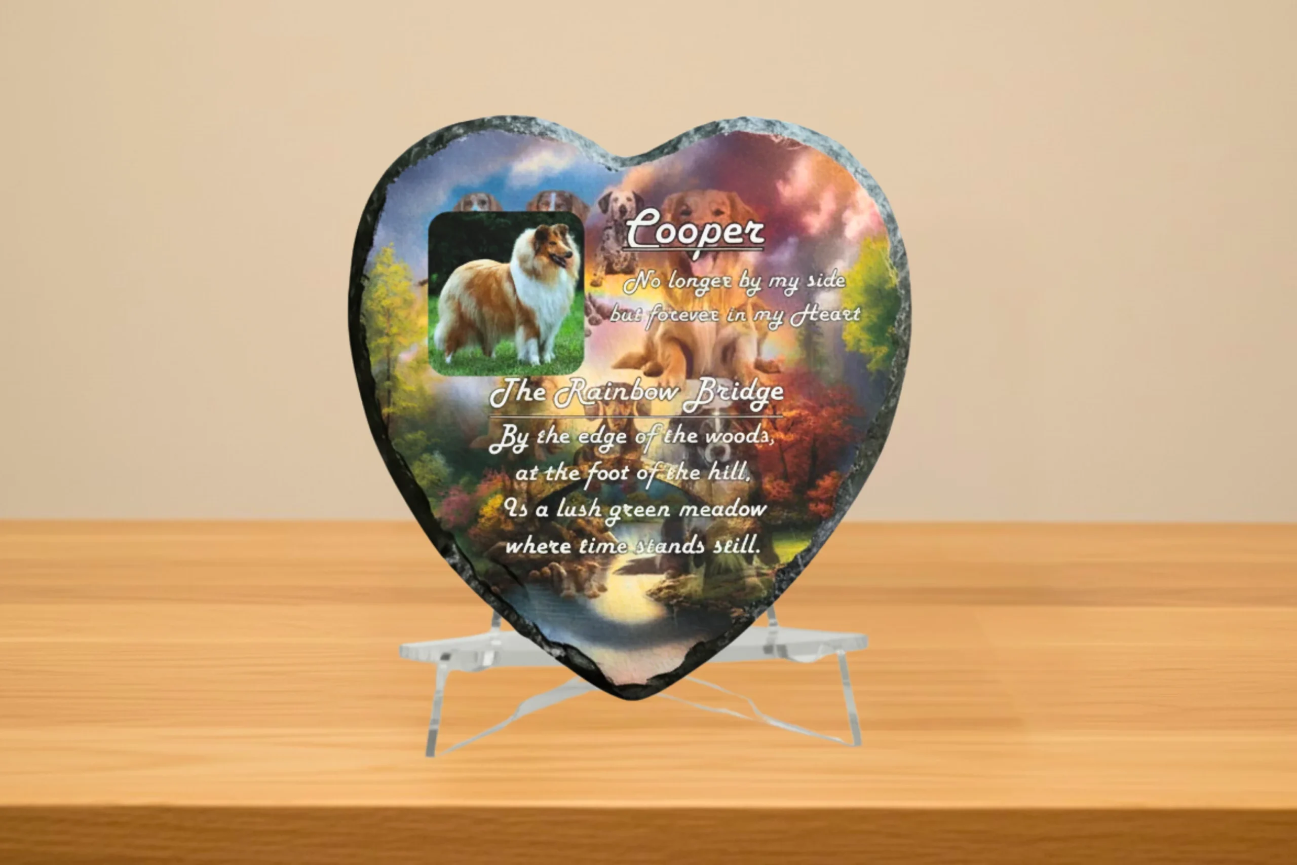 A beautiful mix of memorial plaques with various options to cherish memories of your faithful friend, expressing respect, remembrance, and deep emotions between you and your pet. All designs can be fully personalized to your requirements, including Image, Name & verse. All designs are available in real slate for indoor and outdoor use, or laser-cut 6mm MDF with Acrylic Easel for interior use only.