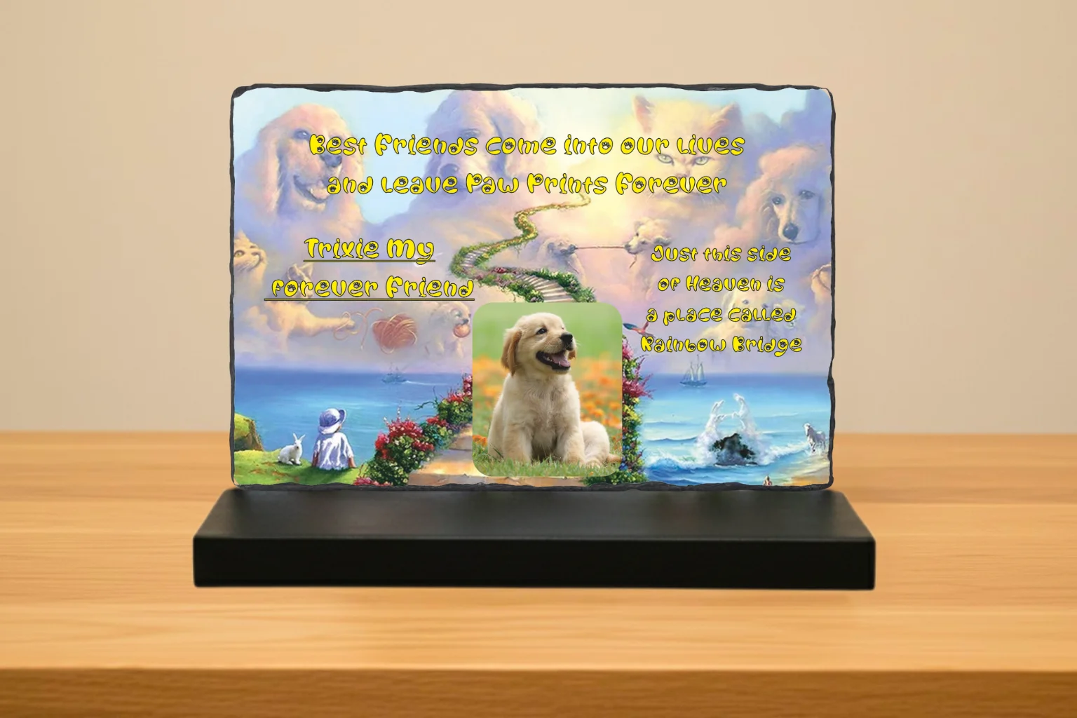 A beautiful mix of memorial plaques with various options to cherish memories of your faithful friend, expressing respect, remembrance, and deep emotions between you and your pet. All designs can be fully personalized to your requirements, including Image, Name & verse. All designs are available in real slate for indoor and outdoor use, or laser-cut 6mm MDF for interior use only.