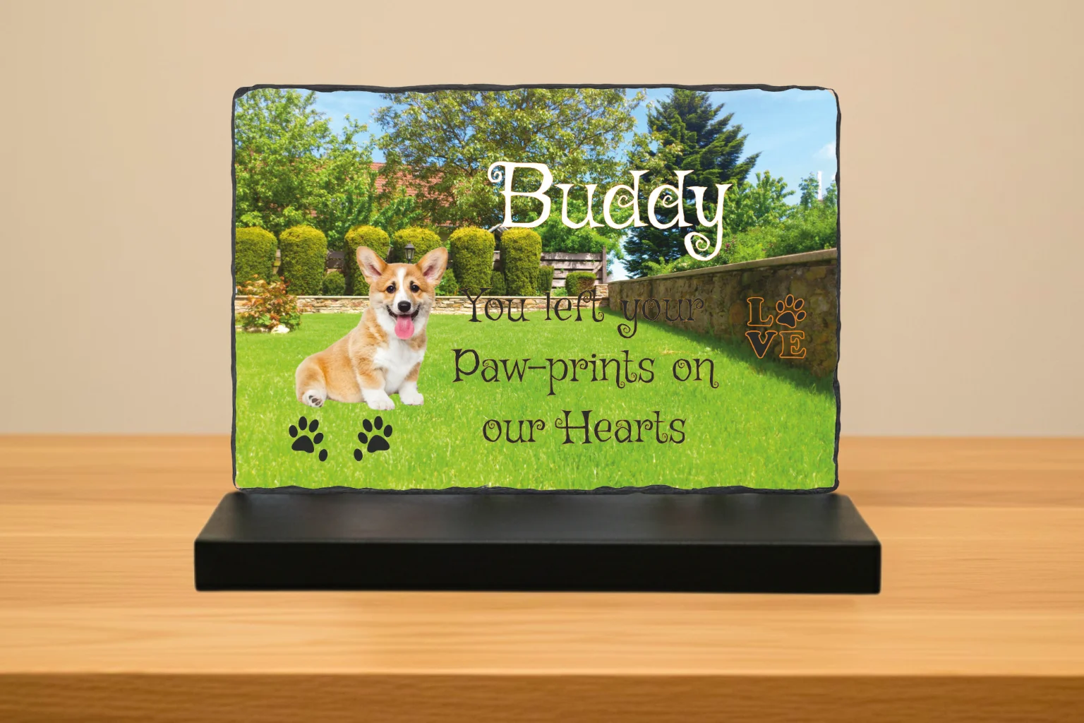A beautiful mix of memorial plaques with various options to cherish memories of your faithful friend, expressing respect, remembrance, and deep emotions between you and your pet. All designs can be fully personalized to your requirements, including Image, Name & verse. All designs are available in real slate for indoor and outdoor use, or laser-cut 6mm MDF for interior use only.